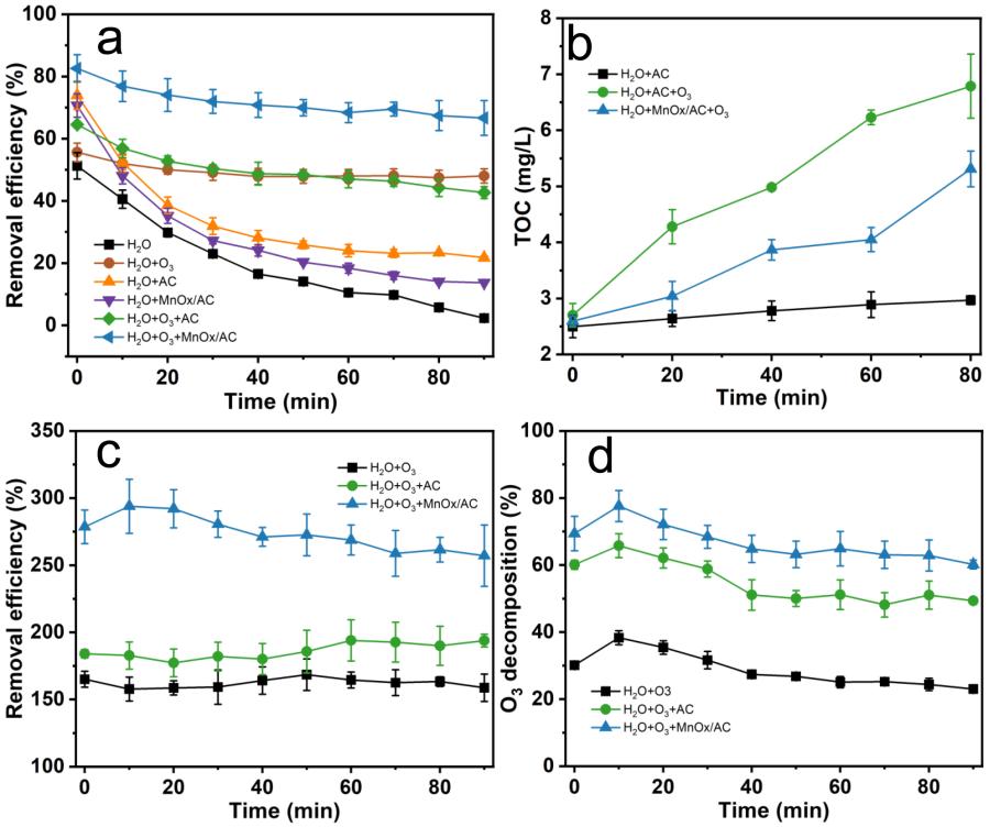 本研究重点考察了O3和MnOx/AC在湿式洗涤器中去除低浓度难溶性VOCs(甲苯)的作用,发现最优条件下甲苯的去除率可维持在71.8%以上,显著优于纯气相催化体系的作用效果。同时,通过多种表征技术,揭示了MnOx表面氧空位和羟基促进大量自由基的生成是甲苯高效去除的主要原因。此外,为了验证该体系处理实际VOCs的效果及稳定性,以汽车水性涂装车间VOCs为研究对象开展了10天的中试研究,发现MnOx/AC+WCO体系对VOCs的去除率可达90%以上,出口浓度远低于排放标准。