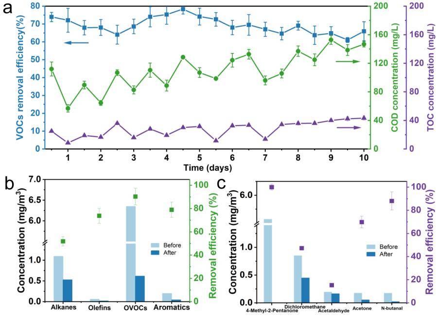 图3.现场实验中VOCs的去除率、吸收液COD和TOC及特征污染物去除率的变化