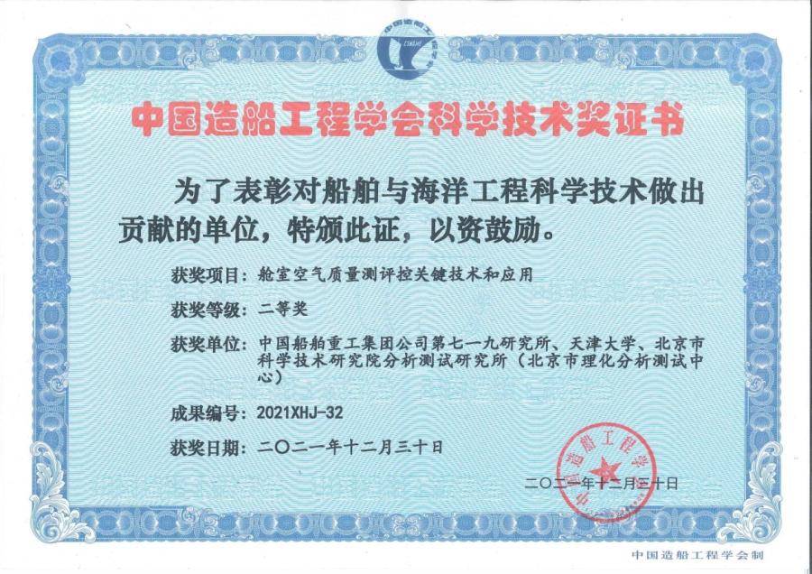 近日,分析测试所收到中国造船工程学会颁发的中国造船工程学会科学技术奖证书,由该所环境污染分析与控制课题组参与,中国船舶集团公司第七一研究所牵头、与天津大学联合完成的 “舱室空气质量测评控关键技术和应用”获得2021年度中国造船工程学会科学技术二等奖(成果编号2021XH-32)。
