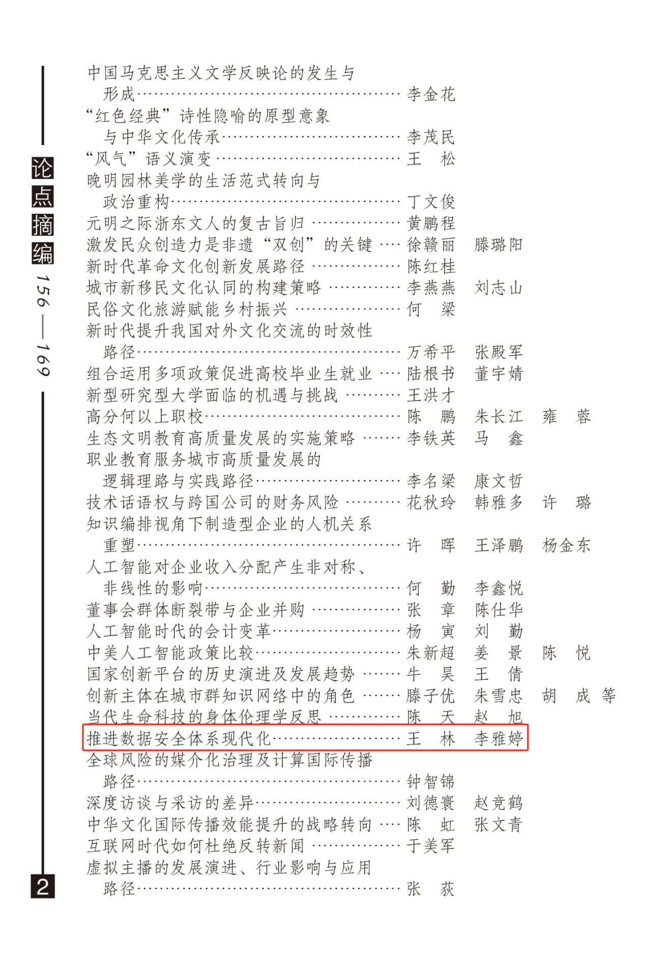 《科技智囊》2024年第5期刊发的论文《推进数据安全体系现代化:风险挑战与实现路径》被《新华文摘》2024年第17期论点摘编转载,题为《推进数据安全体系现代化》。