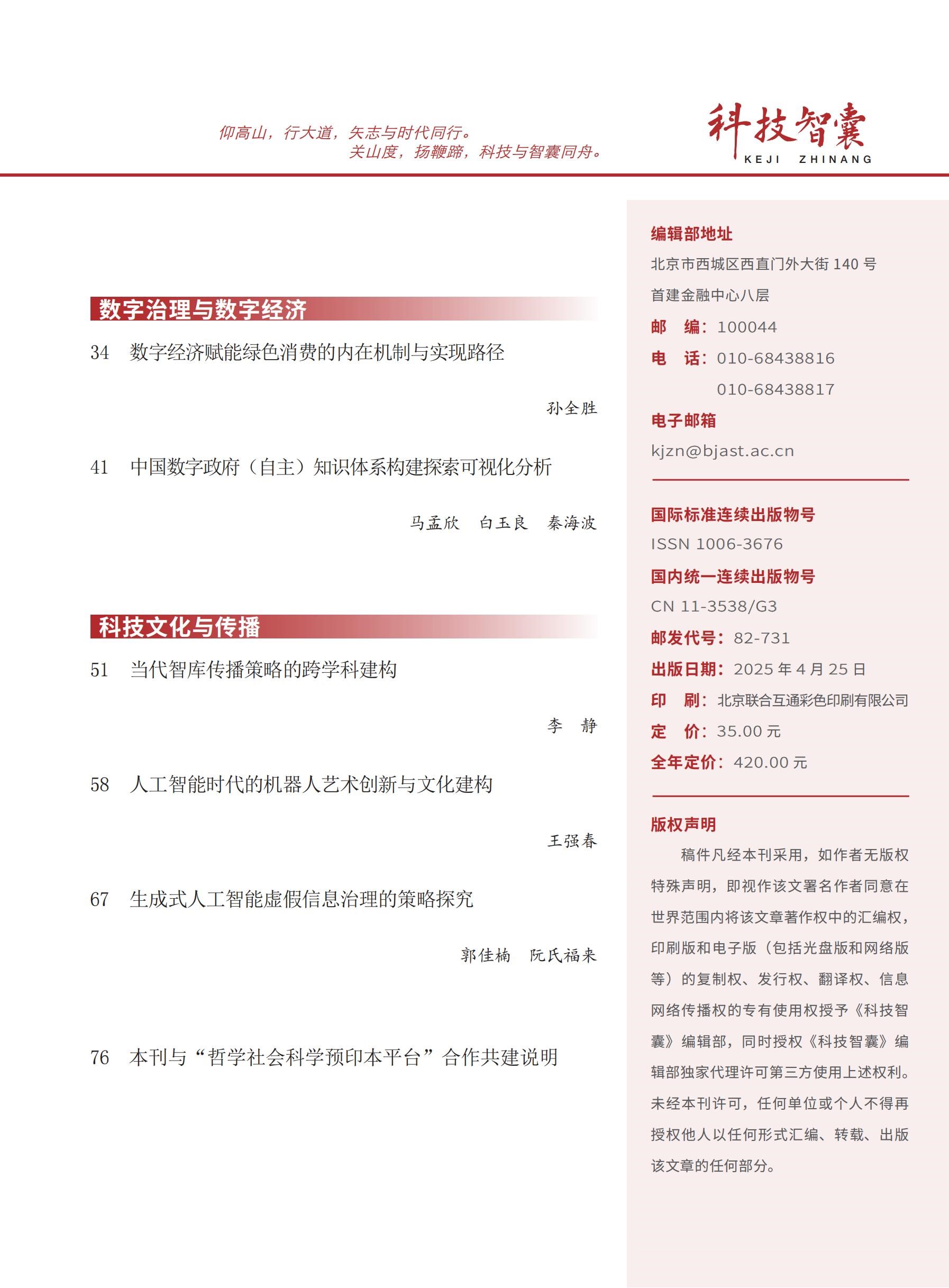 摘要:[研究目的]生成式人工智能(GAI)的发展极大地提升了信息生产效率,但同时也带来了虚假信息泛滥的风险,影响社会信任、市场公平、金融安全乃至国家治理。面对这一挑战,加强虚假信息治理的策略研究具有重要的现实意义和长远价值。[研究方法]采用文献分析法,揭示生成式人工智能虚假信息的潜在风险;以此为切入点,深入剖析生成式人工智能虚假信息产生潜在风险的逻辑成因。[研究结论]为应对生成式人工智能虚假信息泛滥的风险和治理挑战,应当从完善虚假信息治理的规范体系、厘清虚假信息治理的主体责任、优化虚假信息治理的制度环境入手,构建生成式人工智能虚假信息的治理框架,从而为清朗网络空间建设、人工智能技术健康发展和社会稳定提供重要的科学依据和政策参考。