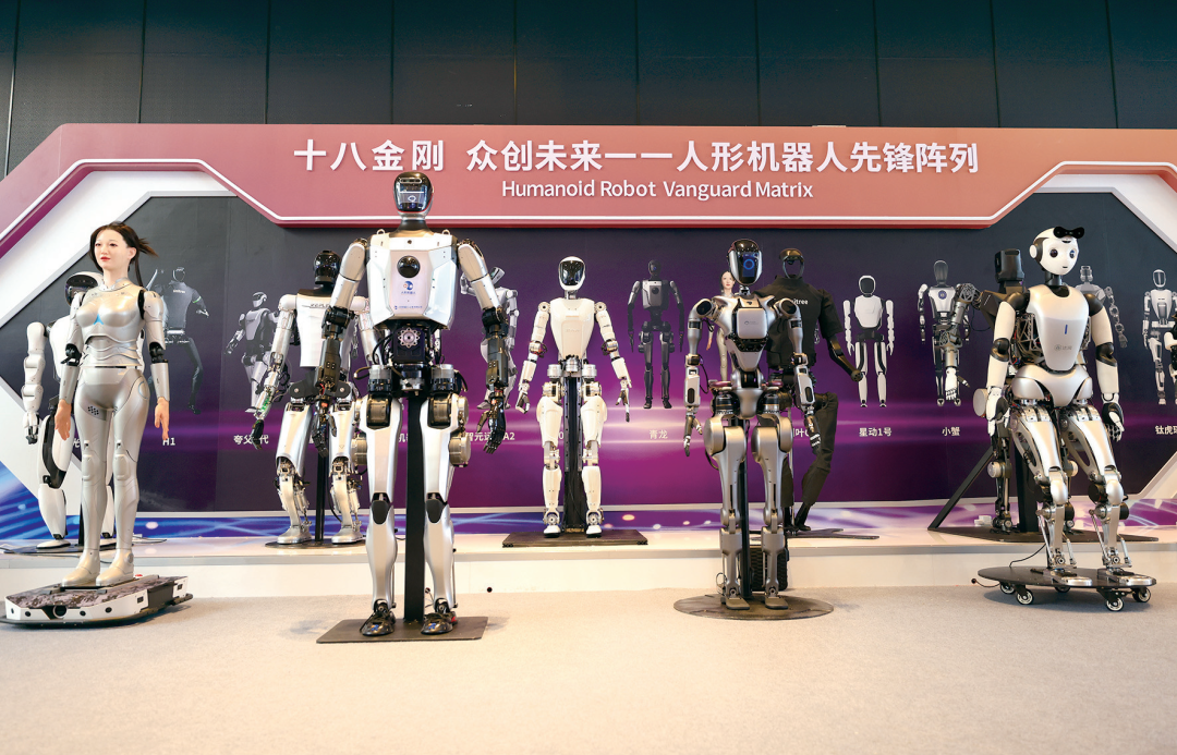 图为2024世界人工智能大会暨人工智能全球治理高级别会议(WAIC 2024),国家地方共建人形机器人创新中心十八金刚人形机器人先锋阵列。