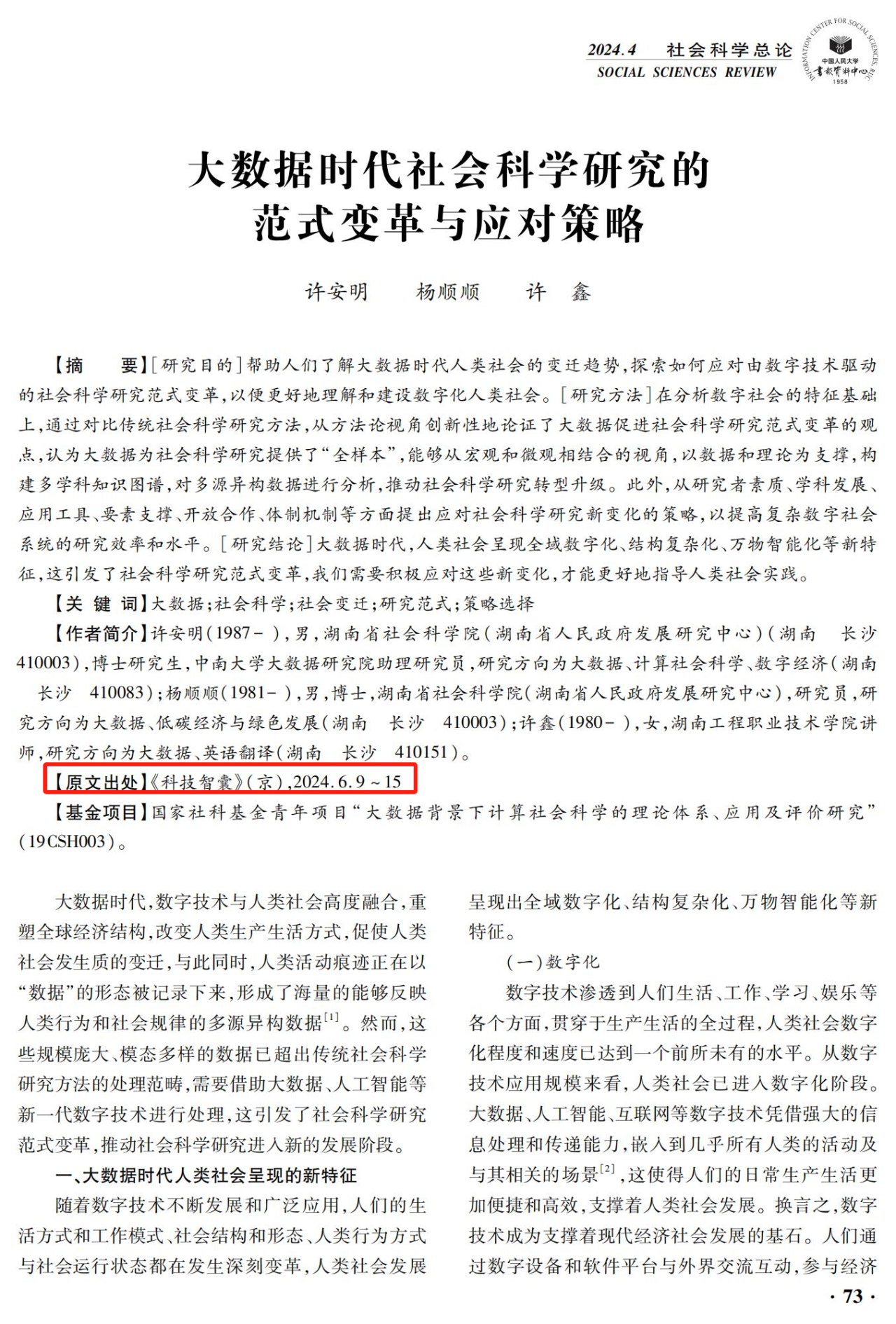 《科技智囊》2024年第6期刊发的论文《大数据时代社会科学研究的范式变革与应对策略》被中国人民大学复印报刊资料《社会科学总论》2024年第4期全文转载。