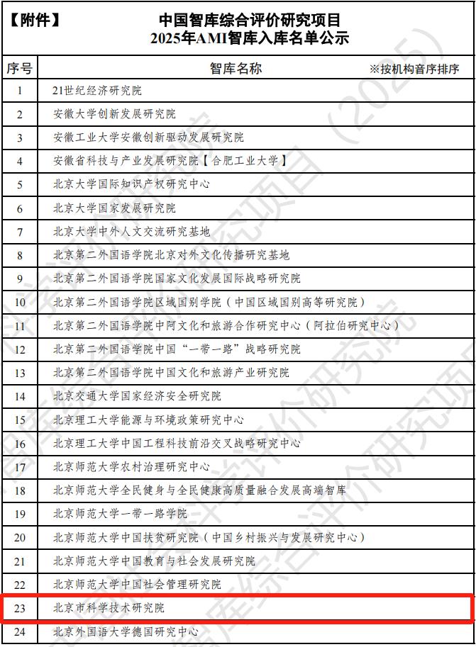 近日,中国社会科学评价研究院正式公示了“中国智库综合评价研究项目(2025)AMI智库”入库名单,幸运彩(以下简称“北科院”)成功入选。