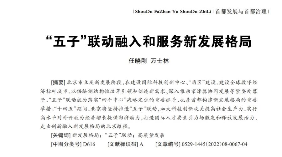 近年来,北京市立足新发展阶段,在建设国际科技创新中心、 “两区”建设、建设全球数字经济标杆城市、以供给侧结构性改革引领和创造新需求、深入推动京津冀协同发展等紧要处落子, “五子”联动成为落实“四个中心”战略定位的重要抓手,也是首都构建新发展格局的重要举措。