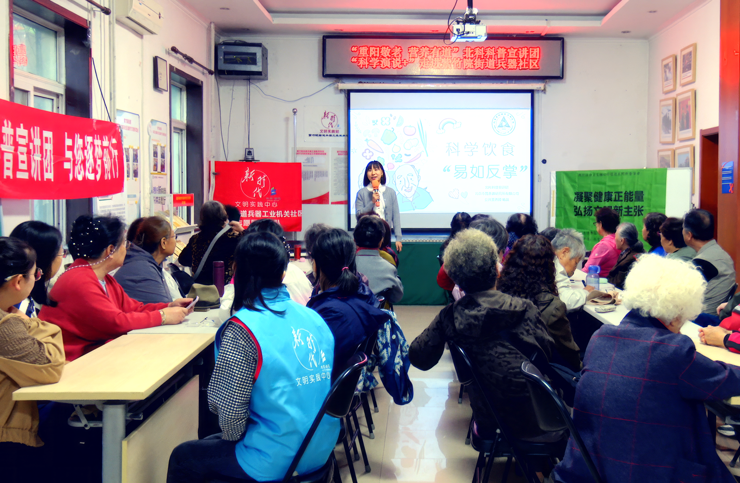在宣讲活动中,北科科普宣讲团科普精英、北京市营养源研究所有限公司公共营养师杨辰围绕“九九重阳节,健康饮食科普暖人心”主题,以《科学饮食“易如反掌”》展开深入宣讲。杨辰为大家详细讲解手掌饮食法,提醒老年人在饮食方面的注意事项,并强调了均衡饮食的重要性,分享过程中告诉大家不仅要合理安排每天饮食,还要控制油脂、盐和糖的摄入量,避免过度油腻和高盐高糖的饮食。还特别针对居民们日常生活中常见的饮食习惯问题进行了讲解和健康提示。