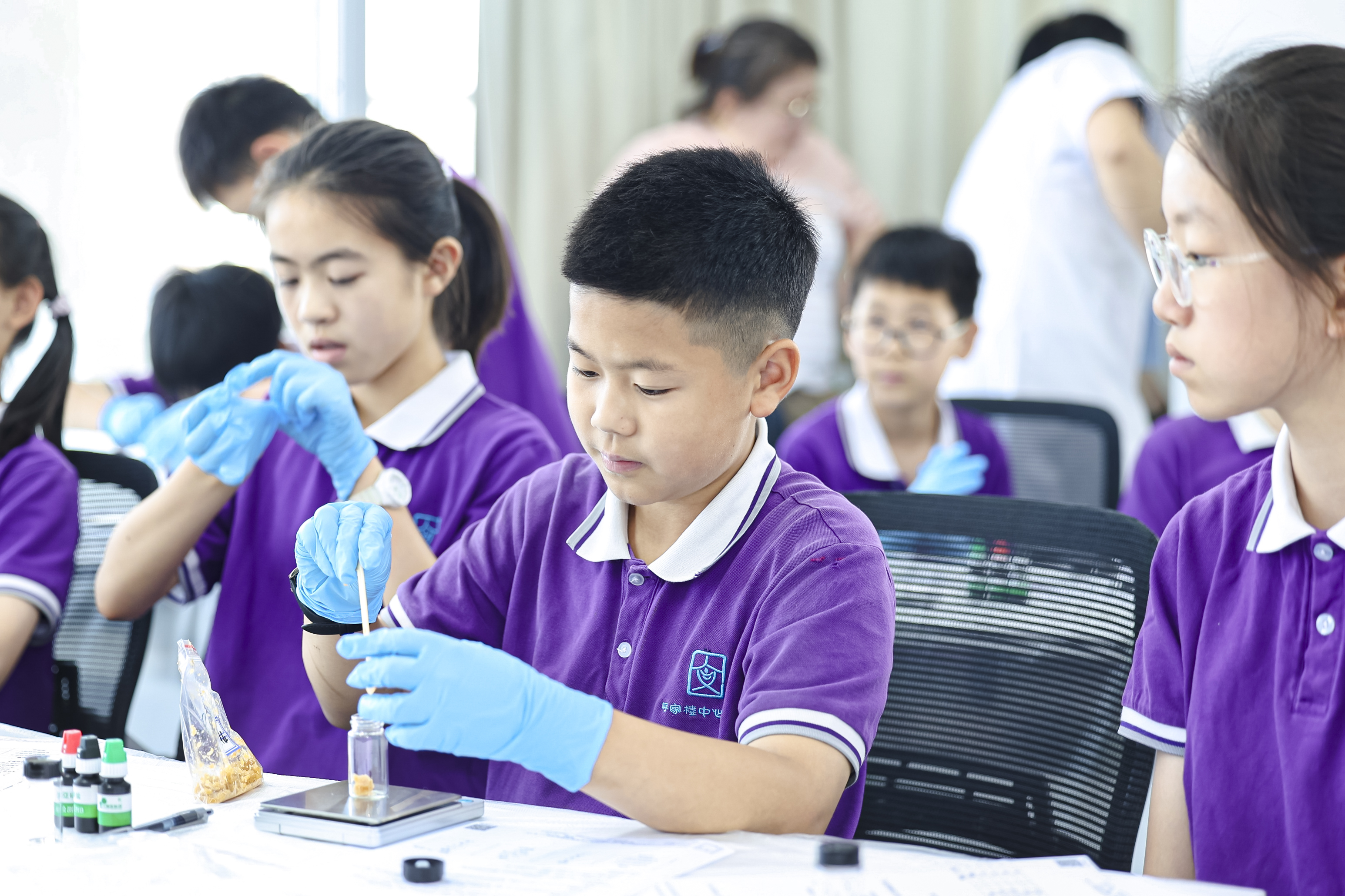 最受期待的“实验体验—舌尖上的科学:酱腌菜中亚硝酸盐检测挑战”环节,同学们分组体验快检方法和食品安全国家标准的部分操作步骤。在分析测试所专业人员的指导下,同学们亲手操作实验器材,化身小小科学家,认真观察实验现象、记录数据,在实践中感受科学实验的乐趣与严谨,体验科学探索的成就感。