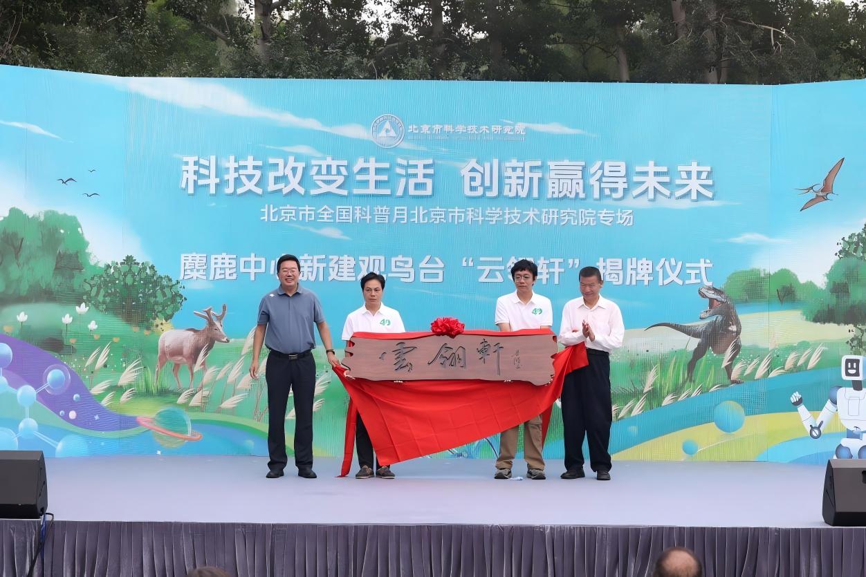 北科院副院级领导刘子亮、中国科学院科学传播中心副主任邱成利共同为麋鹿中心观鸟设施“云翎轩”揭牌。