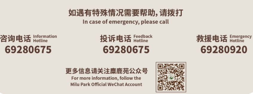 为更好地满足游客的咨询与互动需求,新版导览图在显著位置补充了麋鹿苑官方微信公众号二维码、服务热线电话等信息。游客可随时扫码关注,及时获取苑区动态、活动预告、科普知识等内容,实现线上线下游览体验无缝衔接。