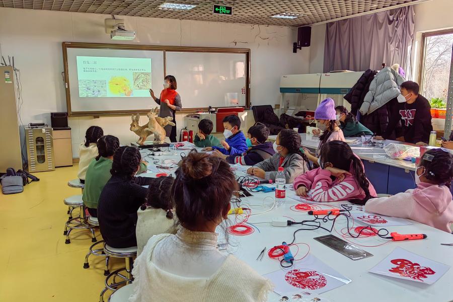 看完新展,凉山彝族小朋友们还参观了“古爬行动物”“动物——人类的朋友”“人之由来”“植物世界”等常设展览,欣赏了自然馆原创4D科普电影《黑羽精灵》,并参加了自然馆探索角主题活动——“玉兔闹春、福兔呈祥”。科普老师介绍了大自然里各种兔和兔的“亲戚们”,引导大家手持3D打印笔制作“福兔窗花”,用木板拓印福兔年画,给孩子们带来了数字技术与传统文化相互融合的新奇体验。