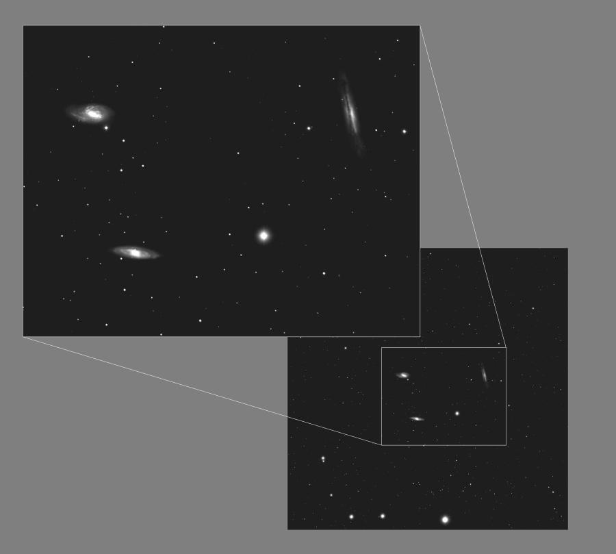 狮子座三重星系全幅和局部放大效果,白光拍摄,30秒曝光,经过本底、平场预处理