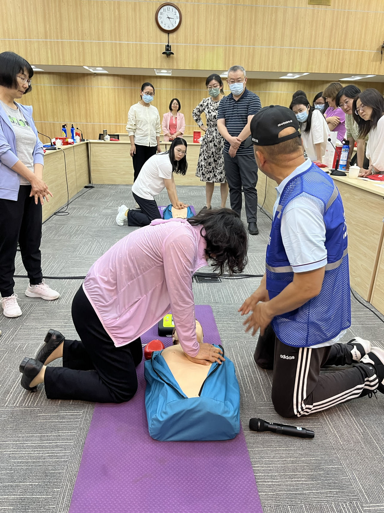 实操演练阶段。参训职工在专业人员的指导下,分组进行心肺复苏和口对口人工呼吸模拟人实操、自动体外除颤器(AED)使用、海姆利克急救法等急救演练,使用灭火毯、逃生面具、灭火器等多种类型消防器材,演练灭火、防护等科目内容。