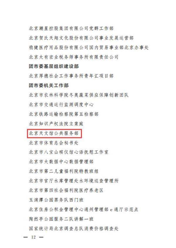 近日,为发挥青年文明号引领作用,更广泛的带动青年在岗位上建功立业、成长成才,我院团委组织院属团支部积极申报2020-2021年度北京市青年文明号主题活动。经过推荐申报、集体公示、创建过程及单位自评、专家评审等多项程序,北京天文馆公共服务部被命名为 “北京市青年文明号”。