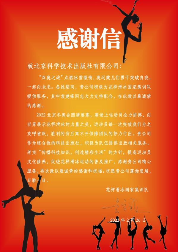 近日,在2022北京冬奥会圆满结束后,北京科学技术出版社有限公司(以下简称北科社)收到花样滑冰国家集训队发来的感谢信,信中对北科社为运动员提供的相关服务及大力支持表达了感谢。