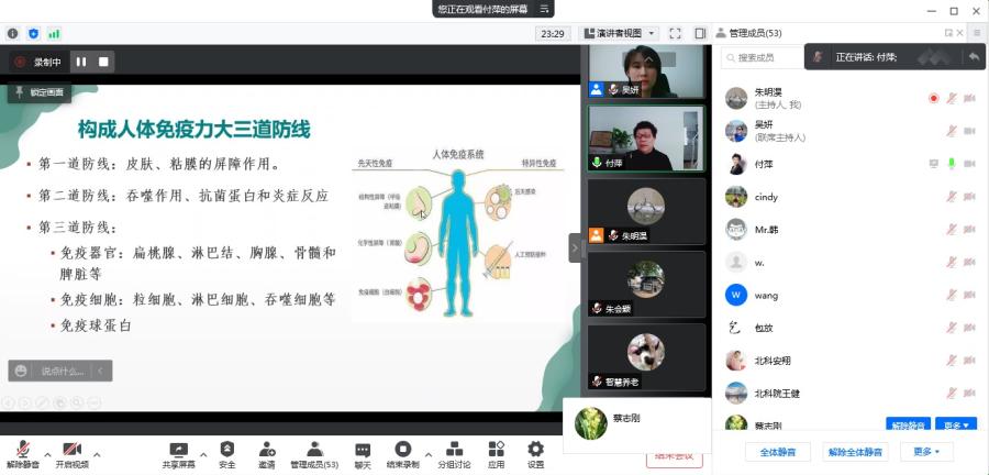 为做好疫情防控常态化下的职工健康工作,推广普及健康的生活方式,营造人人追求健康,学习健康知识的氛围,提高北科院广大职工干部的生活质量。3月11日,院工会举办北科院健康大讲堂-身体免疫及营养健康讲座活动。共有50余名职工参加活动。