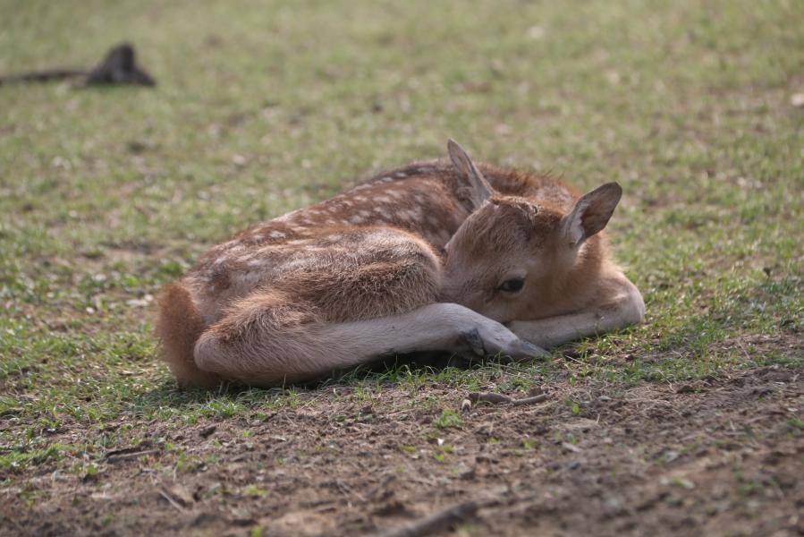 4月8日一大早,科研人员前往巡视时,发现这只小鹿正远离鹿群,安安静静地卧在一个小土坡上休息。可爱极了! (程志斌 钟震宇/文 程志斌/摄)