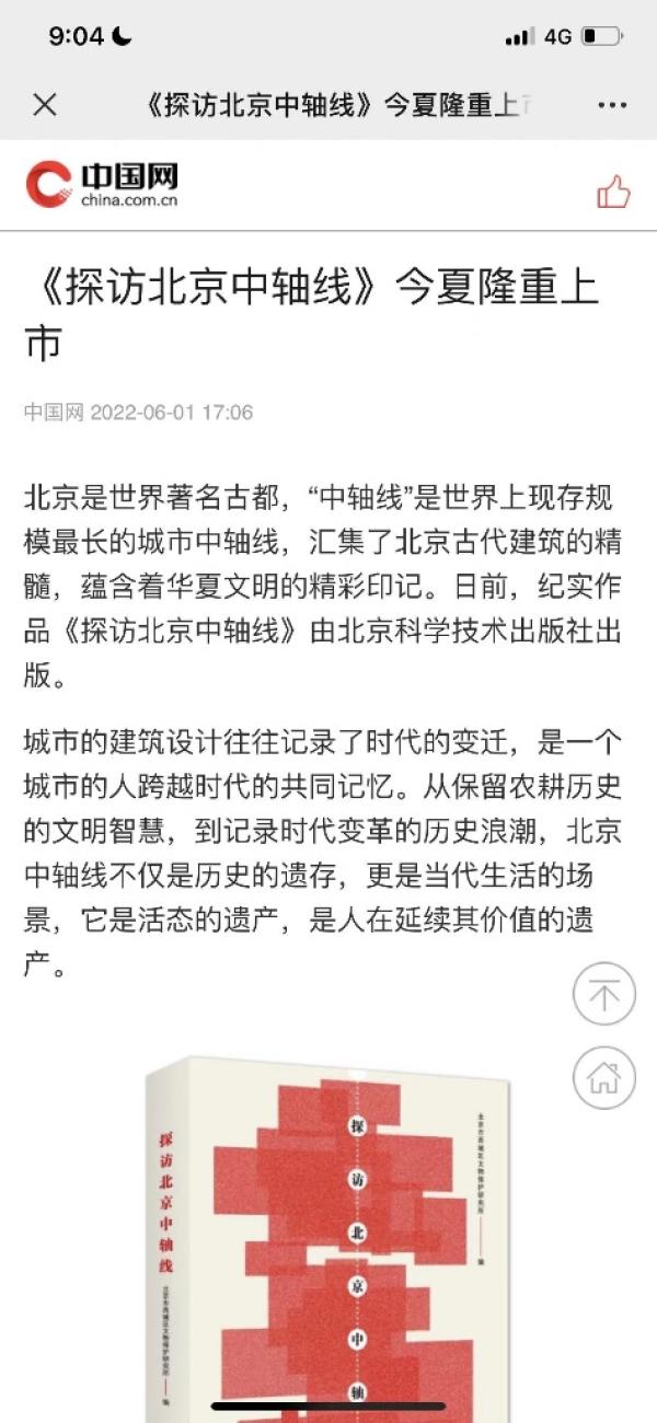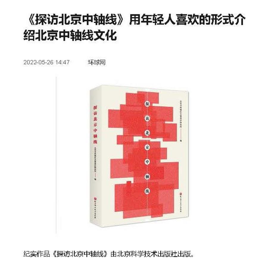 由北京市西城区文物研究保护研究所撰写,北京科学技术出版社有限公司出品的新书《探访北京中轴线》于今夏出版发布。因其丰富详实的知识介绍恰好应和了当前中轴线的申遗保护工作,发布后获得了多家媒体的关注报道。