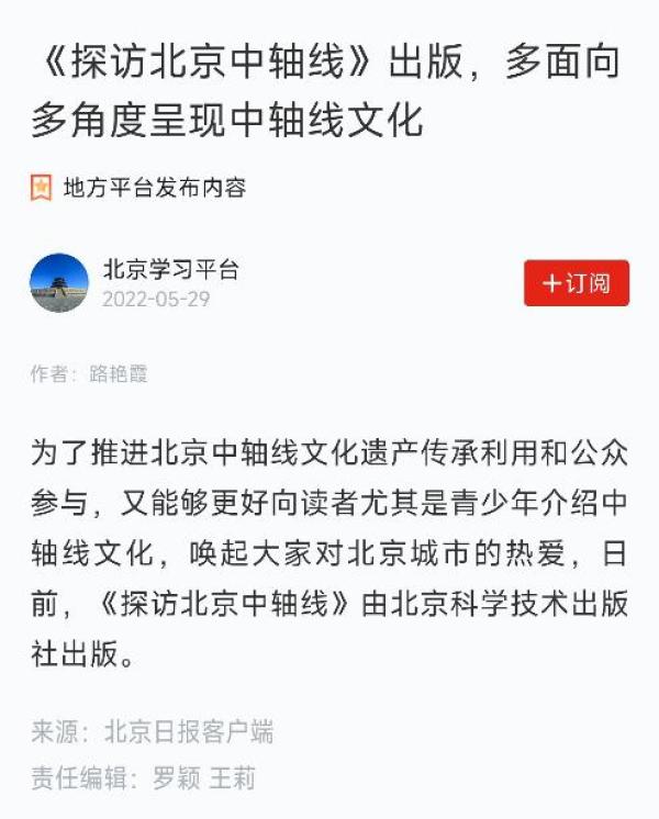 北京日报报道标题:《探访北京中轴线》出版,多面向多角度呈现中轴线文化