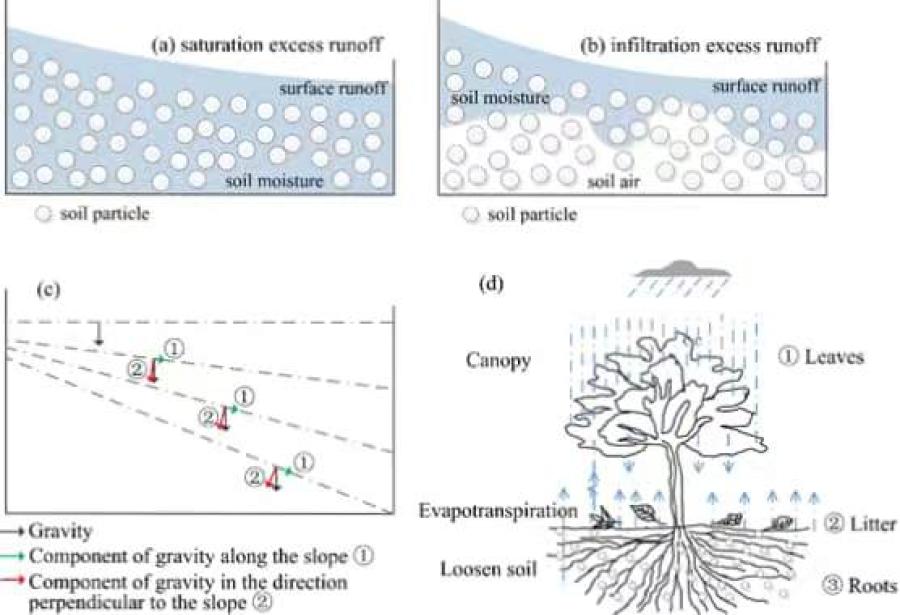 图2(a)-(b)降雨、(c)坡度、(d)植被对地表径流的影响过程示意图