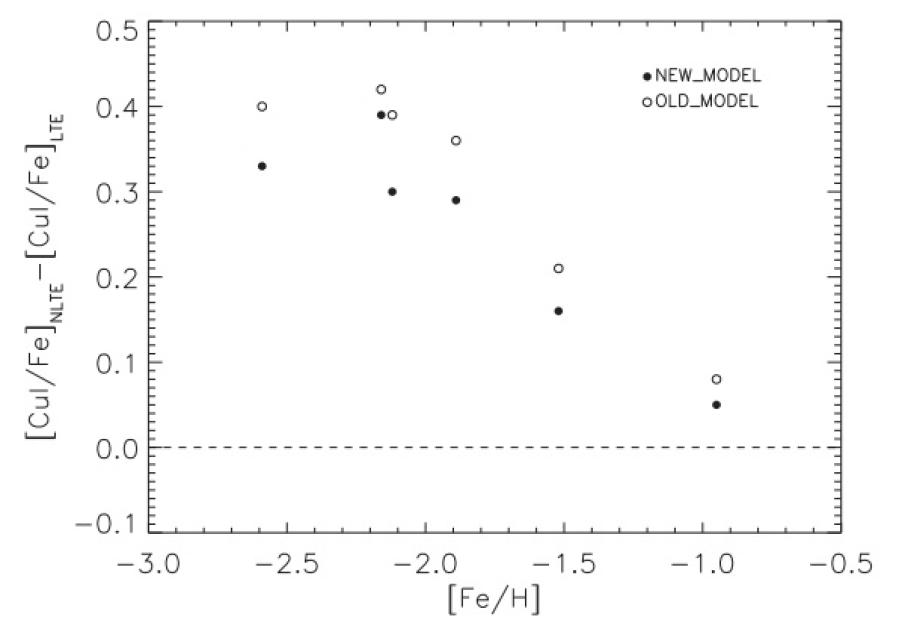 新模型和旧模型下NLTE效应随[Fe/H]的变化