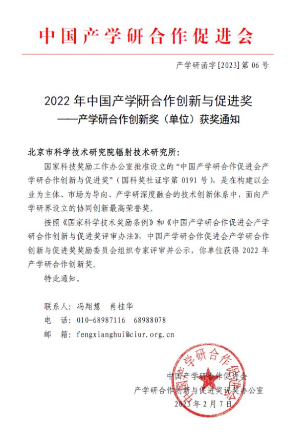 近日,中国产学研合作促进会2022年度“中国产学研合作创新与促进奖”评奖结果揭晓,经组织申报、审查推荐、专家评审、结果公示,辐射技术研究所获得“中国产学研合作创新奖(单位)”,表彰辐射所在产学研合作创新工作中探索产学研合作的新模式、新机制、新方法、新途径,着力构建以企业为主体、市场为导向、产学研深度融合的技术创新体系发挥了重要作用,在推进创新链、产业链、价值链、服务链融合发展中,具有创新引领和示范作用,促进政产学研用的紧密结合。辐射所成效显著、业绩突出,取得较大的经济效益和社会效益,得到了科技界、产业界、教育界、金融界和社会各界的认可。