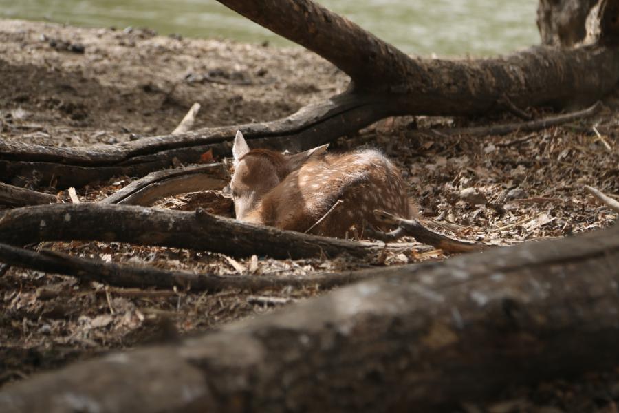 随后,工作人员又在一棵倒柳树下发现了另外一只小麋鹿,它选择的地方较为隐蔽而安全,温暖的阳光透过树林间隙撒在小鹿的身上,橘红色的被毛加上白色斑点形成了很好的保护色,这样很难被发现。