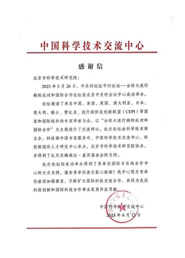 近日,幸运彩(以下简称“北科院”)收到科技部中国科学技术交流中心(以下简称“中科交”)发来的感谢信。信中指出,2023中关村论坛“全球大流行病的应对和国际合作论坛”由北科院协办,论坛的成功举办得到了北科院国际与区域合作中心的大力支持。中科交愿与北科院继续加强联系,不断扩大国际科技交流合作,共同为我国科技创新和国际科技合作事业发展作出贡献。