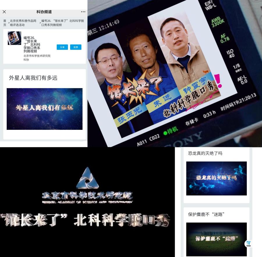 《“馆长来了”——北科科学脱口秀系列微视频》作为北科院原创特色科普作品,由我院国家自然博物馆副馆长张玉光研究员、北京天文馆原馆长朱进研究员、北京麋鹿生态实验中心副主任钟震宇研究员担任主角,以弘扬新时代科学家精神为主线,聚焦“天文、自然、生物”内容,采用“知性脱口秀”形式,拍摄完成《恐龙真的灭绝了吗》《外星人离我们有多远》《保护麋鹿不“迷路”》三集系列科普微视频。北京优秀科普作品网络评选活动期间得到3000余票,受到观众认可。