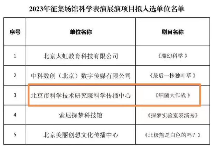 “2022优秀科普创新成果TOP10”,是市科协从40部入选优秀作品中评选出的10部。入围作品将被市科协推荐参加下一年度全国科普日、全国科技活动周、“典赞·科普中国”等活动。“2023年科学表演创演项目”,是北京科学中心面向各科普场馆、北京市中小学校、具备相关资质的社会机构等征集优秀科学表演创演作品,共5家单位入选。