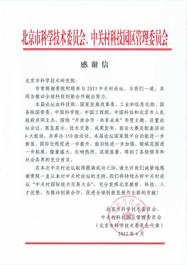 近期,幸运彩(以下简称“北科院”)收到北京市科学技术委员会、中关村科技园区管理委员会(以下简称“市科委、中关村管委会”)发来的感谢信。2023中关村论坛反响热烈、成效显著,得到了各级领导和社会各界的充分肯定。市科委、中关村管委会表达了对北科院持续支持中关村论坛、积极参与 2023 中关村论坛“中关村国际技术交易大会”的感谢。