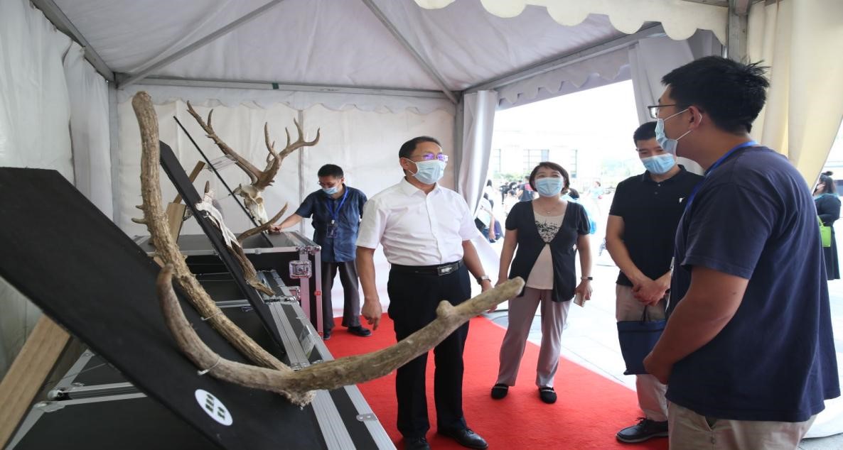 麋鹿中心推出的麋角之美展项。该展项是麋鹿中心围绕可移动临时展项需求近年研发的科普产品。本次推4个展箱,分别展出成年雄鹿头骨及鹿角和亚成体雄鹿鹿角标本,并巧妙的将麋鹿鹿茸期、鹿茸钙化形成鹿角期进行展示,揭示了鹿角生长过程、麋鹿生物学特征。麋鹿中心科研人员还结合移动展箱向观众衍生普及麋鹿建群、鹿王争霸、繁殖等知识,宣传关爱自然,保护自然,构建人类命运共同体的生态理念。