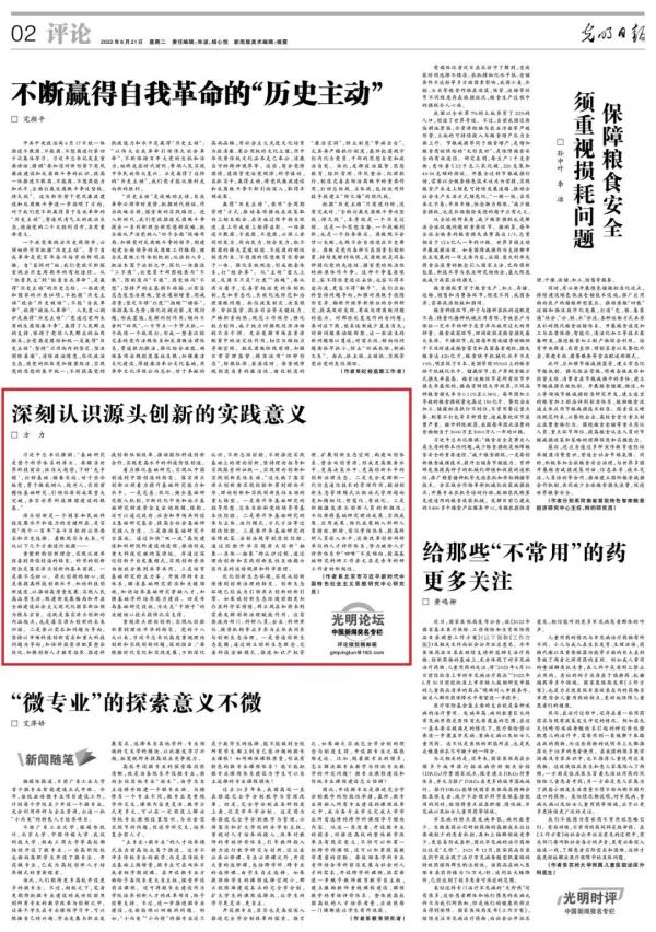 文章认为,源头创新是一个国家和民族科技发展水平和能力的关键所在,是实现“两个一百年”奋斗目标的必然要求和历史选择。落实源头创新必须要坚守源头创新的初心,坚持以市场科技创新需求和重大科技问题为导向;必须要不断完善、优化、健全基础研究投入机制,加快推动基础研究平台落地,大力培养基础研究紧缺人才,积极布局基础研究设施;必须要高度重视理论创新和实践创新问题,实现经验积累到理论升华、理论创新和实践创新良性互动的重大转型;必须要发挥创新治理赋能作用,营造良好创新生态氛围,驱动创新生态管理模式从粗放式管理趋向更加精细化、智慧化、有效化。