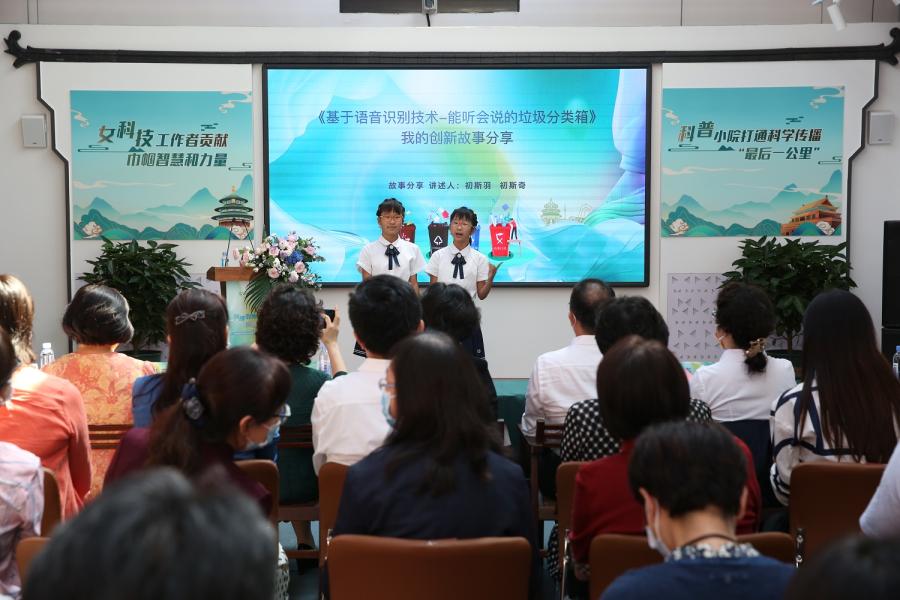 少年科学爱好者双胞胎初斯羽、初斯奇结合作品《能听会说的垃圾分类箱》分享了她们的发明小故事。