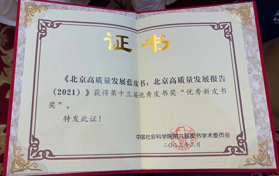 《北京高质量发展报告(2021)》蓝皮书获“优秀新皮书奖”