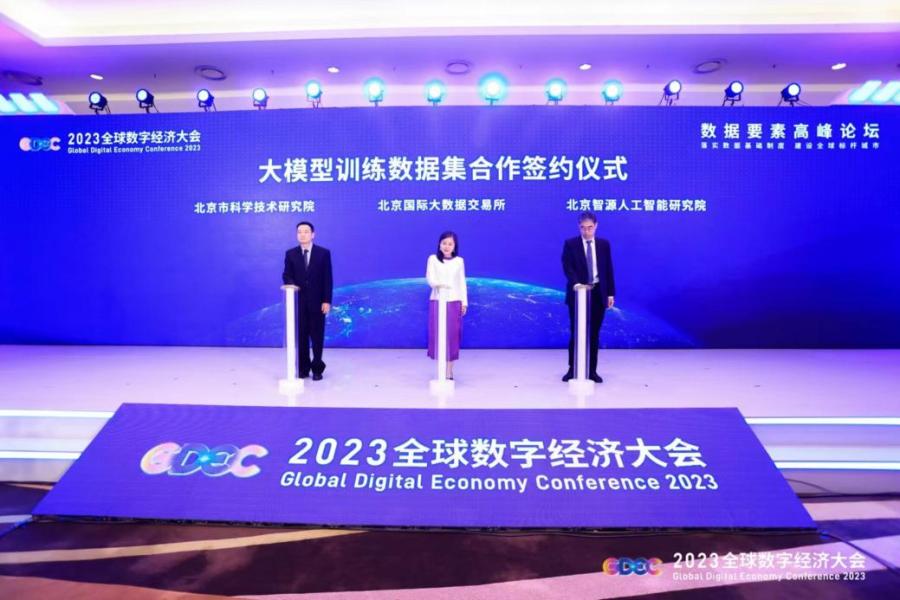 7月5日,在数据要素高峰论坛成果发布环节,我院与北京智源人工智能研究院、北京国际大数据交易所正式签署大模型训练数据集交易协议。北京智源人工智能研究院常务副院长曹岗、北京国际大数据交易所首席专家郎佩佩与我院党组成员、副院长郑欣共同出席签约仪式。